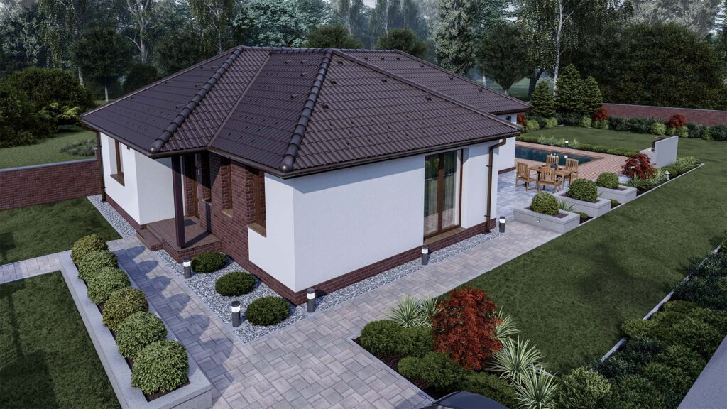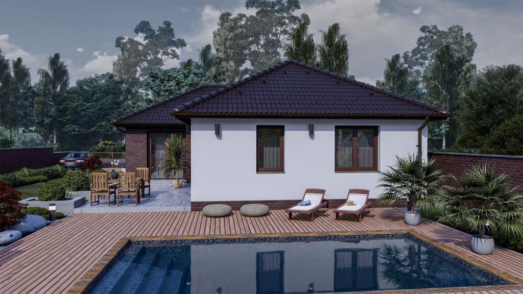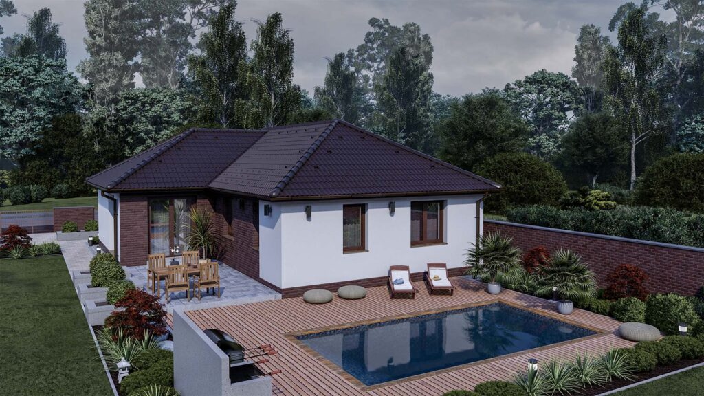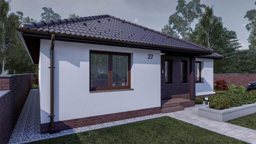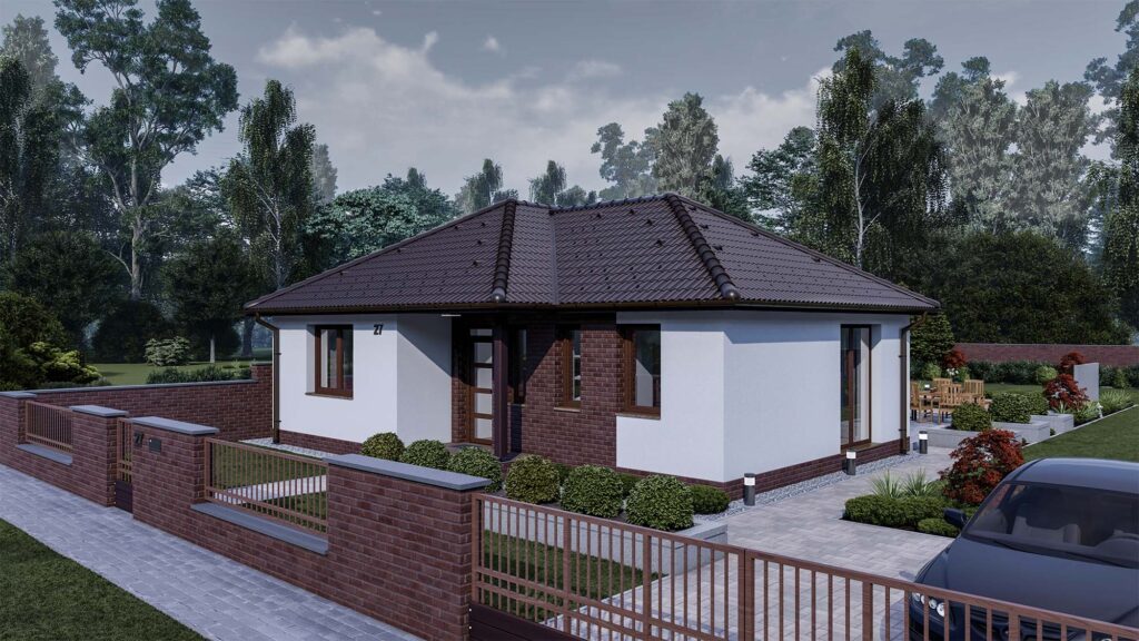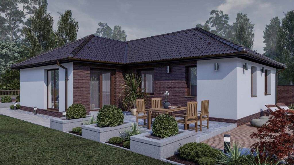 Kellemes arányokkal bíró, keskeny telekre is felépíthető, hagyományos megjelenésű, 105 m2 alapterületű családi ház. 4 hálószobás, melyek közül a szülői háló elkülönül családi közös élettértől és a többi szobától, valamint privát gardróbbal egészül ki. Jól berendezhető, igényes kialakítású, kertkapcsolatos, ideális otthon nagycsalád részére. Hosszú távon is alacsony energiaigénnyel fenntartható otthon. Oldalhatáros beépítésű telekre ideális az elrendezés.