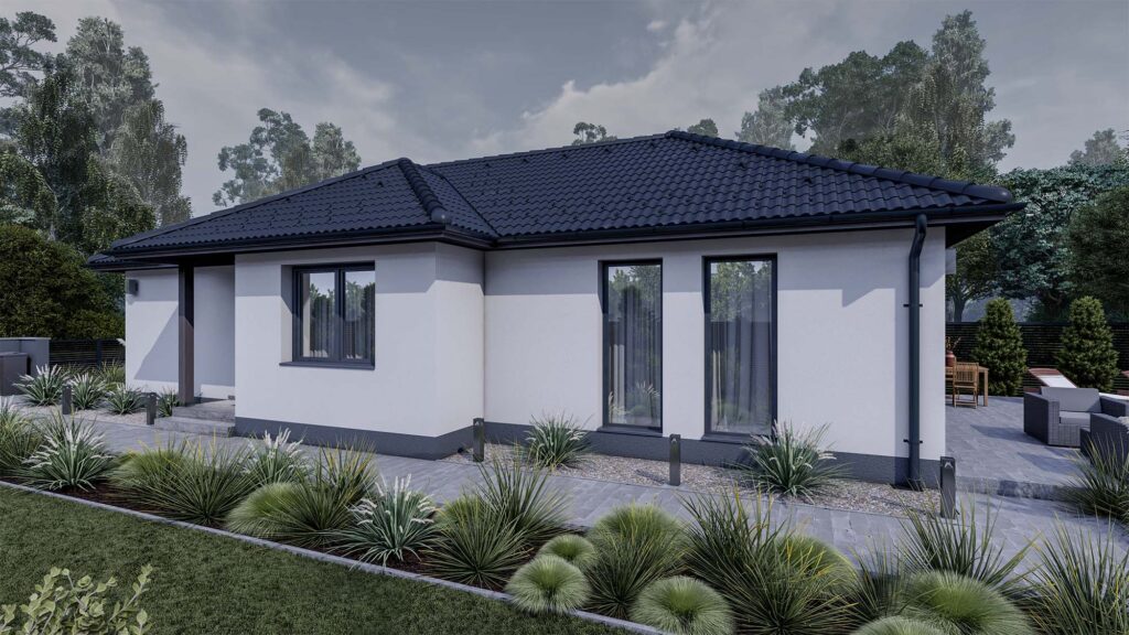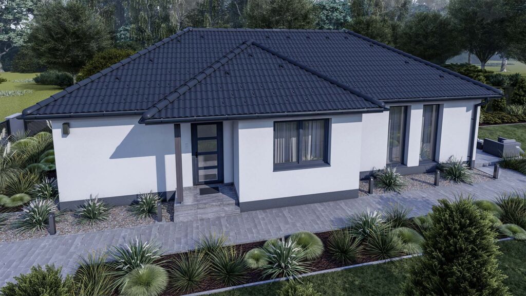 Nappali + 3 szobás, kényelemre hangolt, 90 m2 alapterületű családi otthon, keskeny telekre tervezve, mely maximálisan kielégíti egy négytagú család igényeit is. A közös élettértől szeparált hálószobák, a szülői háló intimitást biztosító elhelyezése egyben teszi hosszú távon is praktikussá és időtlenül szerethetővé, értékessé. Egyszerűség, kényelem elegáns kivitelben, mindez alacsony üzemben tartással.